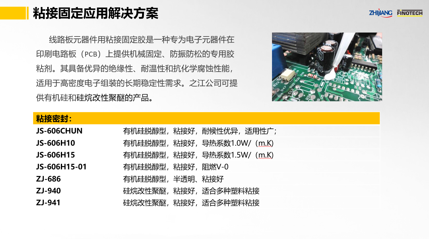 之江公司立足于中国胶粘剂行业领军企业和有机硅、聚氨酯、环氧等专业胶粘剂的创新和产业化优势,具有国家高新技术企业和国家级企业技术中心资质,依靠国家级CNAS实验室以及国家级博士后科研工作站,并有国际专家助力,为PCB印刷线路板的三防涂敷、粘接固定、导热灌封等提供系统用胶解决方案。其中,关键产品如下: